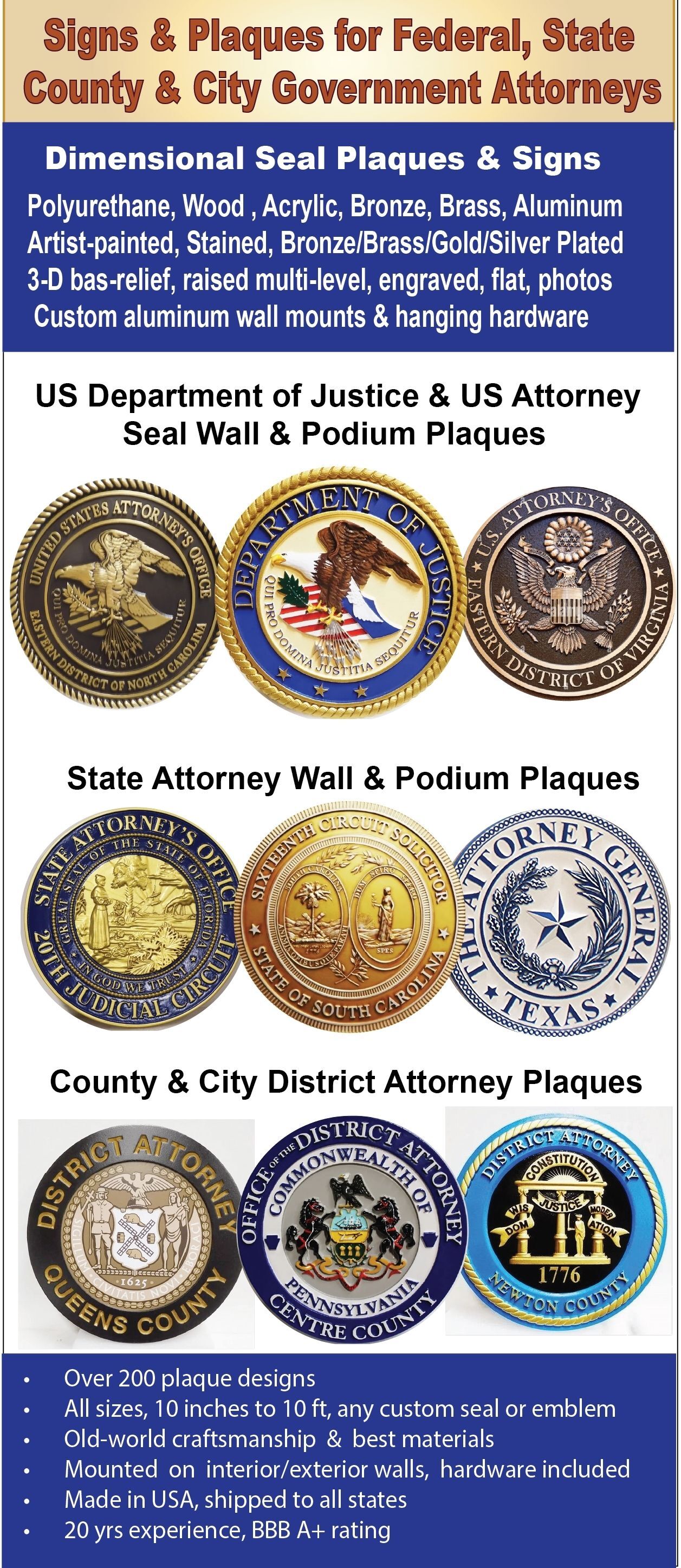 This page provides a description and photo gallery (scroll down to the bottom of this page) of our standard, custom, and personalized wall and podium plaques for buildings of Government Attorneys in the U.S. Department of Justice, State Attorneys, and County/City District Attorneys. Please see our web page Overview of Court Plaques for a general description of our styles, sizes, materials and prices of Federal, State, County and Municipal Court and Attorney plaques.