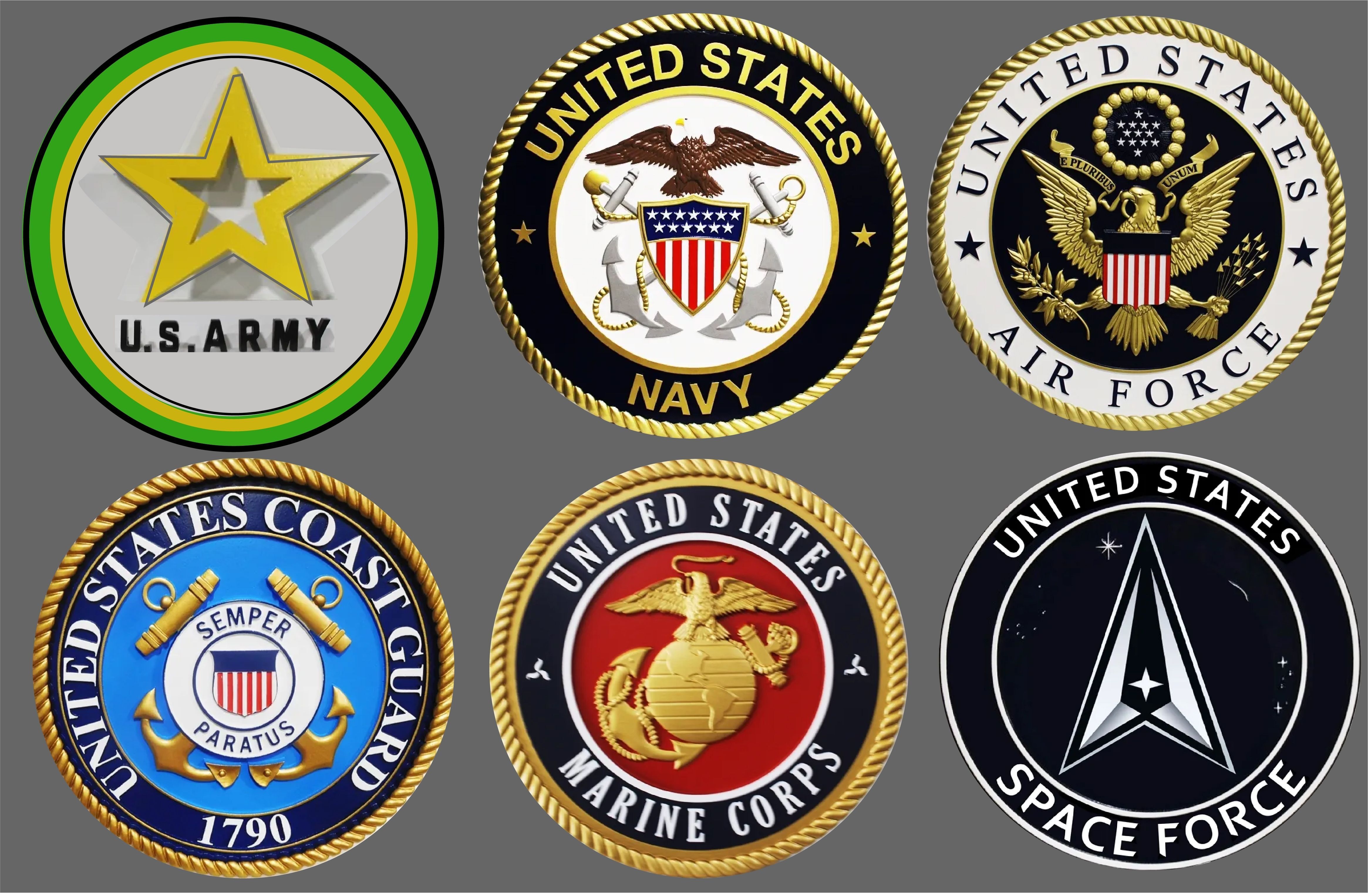 Fig. 1- Shown above are artist-painted plaques of the six armed forces official service seals we manufacture. These can be purchased separately or as a set. We have several versions of these (aluminum, brass, bronze, artist-painted HDU, mahogany, printed giclee vinyl on acrylic). Typical sizes range from 12 inches to 96 inches in diameter. These plaques can only be purchased by the military of Federal government for official use.